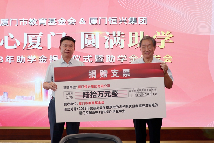 恒興集團今年向廈門教育基金會捐贈的60萬元愛心助學金,將用于資助100名今年被高等院校錄取、品學兼優(yōu)但家庭經濟困難的優(yōu)秀學子。去年,廈門恒興集團也向安溪慈善總會、廈門市教育基金會捐贈了120萬元助學金。